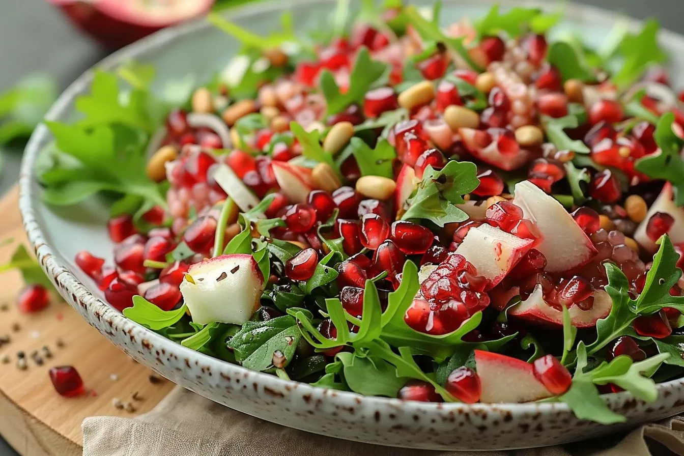 • Presentation Matters: Arrange the ingredients artfully on a platter or in a bowl for a visually appealing presentation. The vibrant colors of the pomegranate seeds and greens make this salad a feast for the eyes as well as the palate.